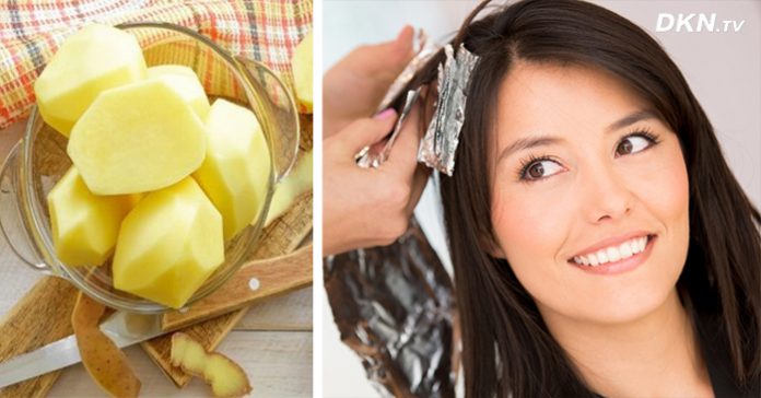Theo nghiên cứu, vỏ khoai tây là nguyên liệu có khả năng phục hồi tóc vô cùng hiệu quả. Dưỡng chất chứa trong nó sẽ làm tăng sản sinh melanin giúp tóc phục hồi màu đen vốn có. Hơn nữa, vitamin chứa trong loại vỏ này còn góp phần giúp tóc mềm mượt và óng ả tự nhiên. Đặc biệt hơn, chất chống oxy hóa trong vỏ khoai tây giúp bảo vệ tóc trước tác hại của môi trường, nhiệt độ cao, tia tử ngoại… một cách toàn diện nhất.Cách thực hiện:
