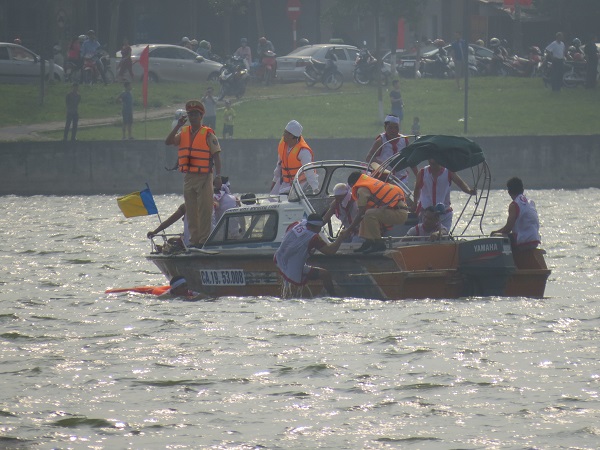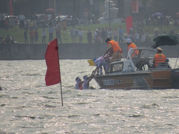 Tuy nhiên, ngay trong lượt thi đầu tiên, thuyền của đội chải Bạch Hạc (TP.Việt Trì) bỗng bị lật, khiến hơn 20 VĐV đều bị chìm nghỉm. Rất may đội cứu hộ đã có mặt kịp thời nên không có ai bị thương vong.