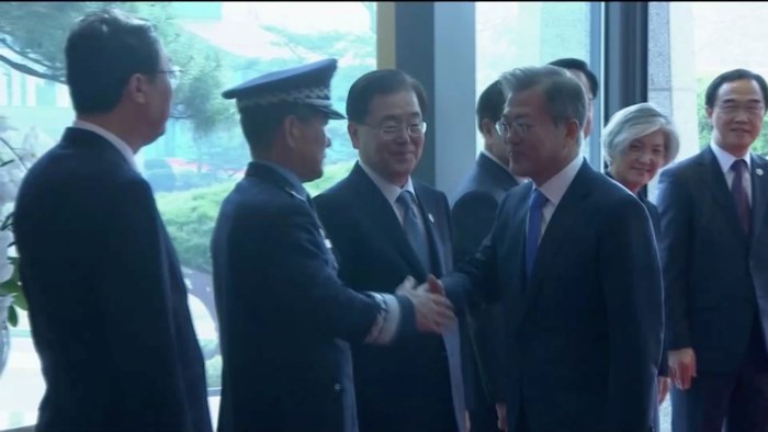 Tổng thống Hàn Quốc thì muốn theo đuổi chiến lược "hành động đổi hành động" mà phía Bình Nhưỡng sẽ đi từng bước để giải giáp kho hạt nhân để đổi lại các hỗ trợ kinh tế và đảm bảo về an ninh. Seoul nói toàn bộ quá trình này dự kiến kéo dài trong hai năm.