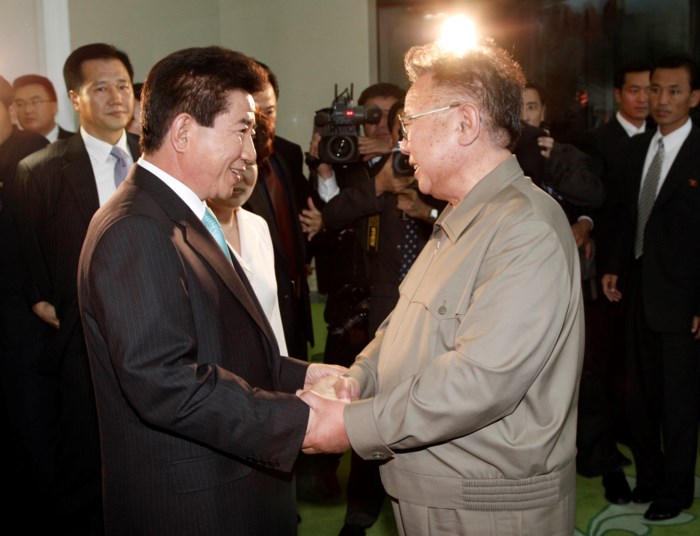 Tháng 10/2007, Tổng thống Hàn Quốc Roh Moo Hyun (trái) bắt tay Chủ tịch Kim Jong Il tại Bình Nhưỡng trong thượng đỉnh liên Triều lần 2. Ảnh: Reuters.
