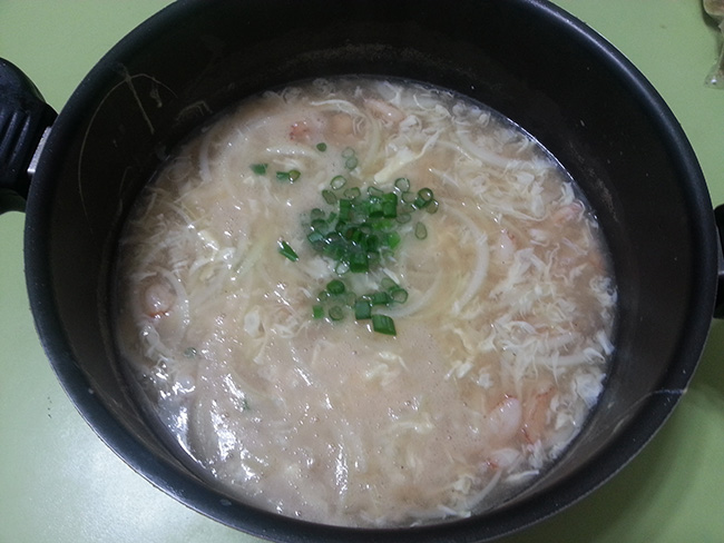 - Bước 4: Xương ức gà sau khi đã hầm xong thì vớt xương ra bỏ đi, tiếp theo bạn cho nguyên liệu hải sản đã ướp gia vị vào cùng và khuấy đều. Trong khi đó bạn hòa tan bột năng với nước sau đó chế từ từ vào nồi súp, vừa chế vừa khuấy đến khi thấy súp có độ đặc như ý là dừng lại.