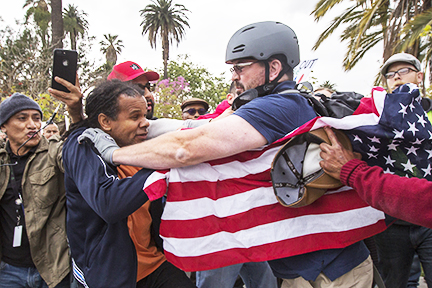 Một người đội nón an toàn và quàng cờ Hoa Kỳ trên người đã tham gia một cuộc biểu tình chống di dân. Đoàn người của ông ta đã đụng độ một nhóm người Latino cũng xuống đường dưới phố Los Angeles vào trưa thứ Ba. Rất may là ông di dân bên trái chỉ bị ông Mỹ đẩy ra, chứ không bị... bóp cổ cho nghẹt thở.