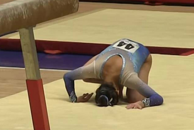 Cụ thể, đã có tới 5 bộ phận của cô gái chạm đất gồm: 2 chân, 2 tay và đầu. Sau khi dính cú ngã quá nặng, cô nàng vẫn có thể đứng dậy nhưng bước đi lảo đảo và cần tới sự trợ giúp của huấn luyện viên. Các lãnh đạo thể dục dụng cụ nước Mỹ sau đó tuyên bố tin mừng trên Twitter rằng nữ VĐV này vẫn có thể thi đấu chung kết.