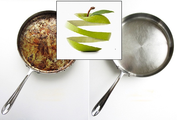 Bạn chỉ cần bỏ vỏ táo vào nồi, đun sôi và để nhỏ lửa từ 40-50 phút, vết cháy đen sẽ dần dần biến mất, sau đó rửa lại nồi là sạch