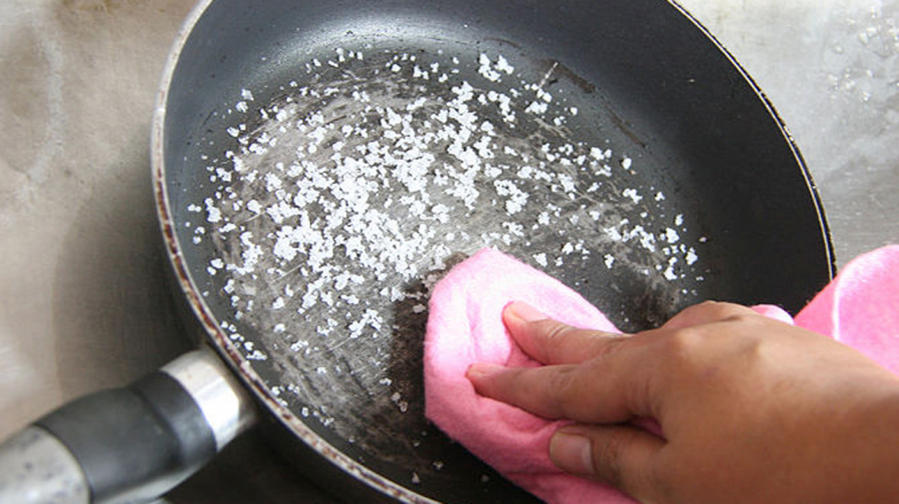 Cách làm sạch xoong nồi bị cháy đen bằng muối đã là cách làm rất phổ biến. Đơn giản chỉ cần rắc muối trắng vào nồi và cho thêm một ít dấm, sau đó ngâm nồi trong vòng 10-15 phút. Tiếp theo bạn dùng miếng chà nồi chà nhẹ nhàng thì các vết cháy sẽ bong ra. Sau đó đổ thêm 1 ít dấm và ngâm trong vòng 10 đến 15 phút. Tiếp theo bạn đem xoong nồi đi rửa sạch. Vậy là bạn đã có chiếc nồi sáng bong như mới rồi nhé.