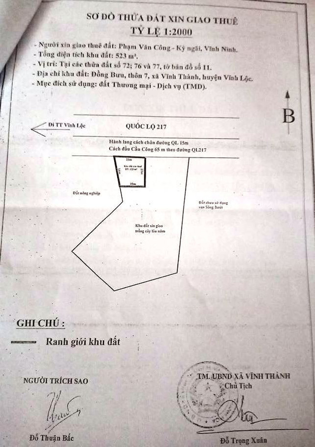Trong hợp đồng được Trưởng Phòng TN-MT Nguyễn Văn Công (đại diện chính quyền) đứng ra cho ông Phạm Văn Công thuê 523 m2 đất tại xã Vĩnh Thành (huyện Vĩnh Lộc) có hồ sơ nêu rõ khu đất được thuê có chiều rộng mặt đường Quốc lộ (QL) 217 là 25 m (phía trong là 20 m2) và có chiều sâu là 24 và 23 m.