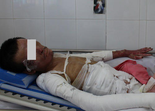 Qua thăm khám, bác sĩ xác định bệnh nhân bị bỏng nặng 20% cơ thể, tập trung ở 2 tay, cổ, thân. Sau khi được chăm sóc, điều trị tích cực, bệnh nhân đã tạm qua được giai đoạn sốc bỏng. Tuy nhiên, vùng bị bỏng nặng đang gây hoại tử, nhiễm trùng.
