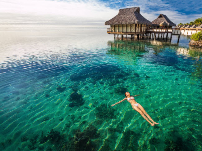 Nữ du khách thư giãn trong làn nước trong như ngọc tại đảo Moorea, Tahiti.