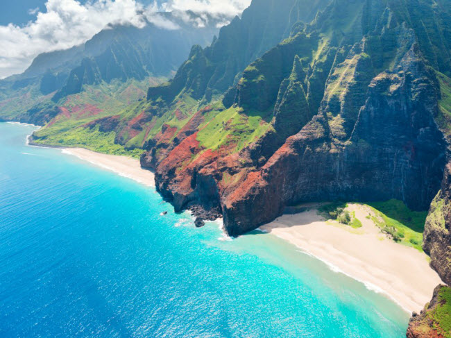 Song biển đánh vào dãy núi hùng vĩ trên đảo Kauai, Hawaii.