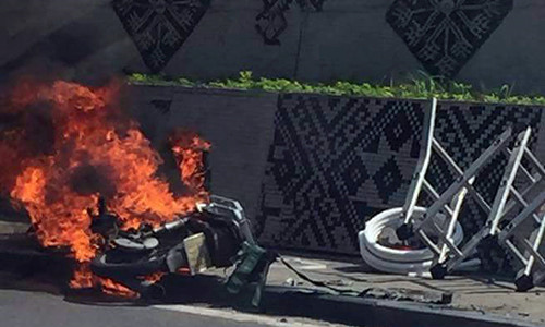 Trưa ngày 14/5, khi một xe máy khi đang lưu thông, di chuyển trên đường Yên Phụ (Hà Nội) khi đến ngã tư rẽ vào Cửa Bắc thì bất ngờ bị cháy. Chủ chiếc xe tiếc của vẫn cố dỡ đồ phía sau rồi mới tháo chạy.