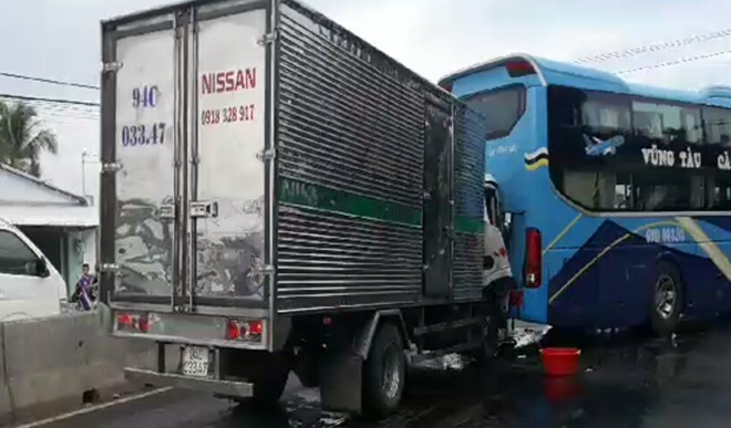 Khi anh Khang và ông Tạo chưa kịp xuống xe để cùng nhau xử lý vụ việc thì xe khách biển số Cà Mau chạy đến, thông qua xe máy và đuôi ôtô tải. Trong nháy mắt, xe khách này bị một xe tải khác tông mạnh từ phía sau.