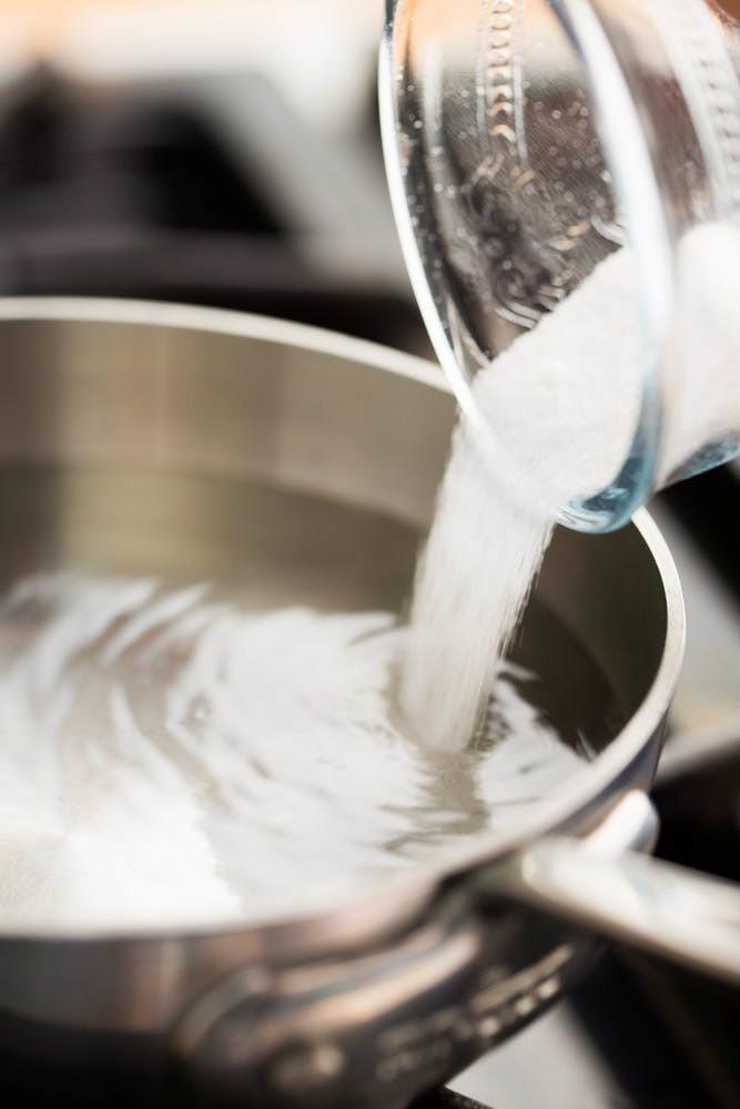 Cho muối, giấm, đường, nước vào nồi đun sôi lên.
