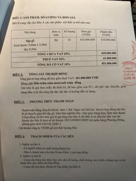 Lần theo hợp đồng mua bán gỗ, chúng tôi tìm được ông Đặng Minh Q – Giám đốc công ty đồ gỗ có trụ sở tại quận 2, là đơn vị bán hàng cho khách sạn Victory. Sau khi xem các ảnh và clip ghi nhận, ông Q xác nhận sập gỗ này do chính mình bán vào ngày 30.11.2017. “Tôi sẽ kiểm tra lại hợp đồng cũng việc giao nhận và sẽ trả lời cụ thể về nguồn gốc xuất xứ sập gỗ này”. Về chất lượng sập gỗ, ông Q cho biết sẽ kiểm tra và trả lời sau.
