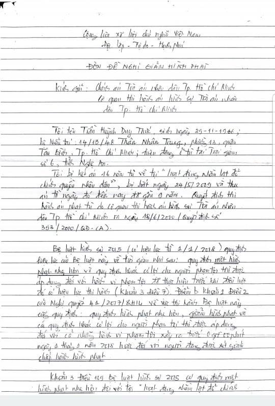 Đơn được anh Thức gửi đi từ trại giam vào ngày 28-1-2018 với các căn cứ: