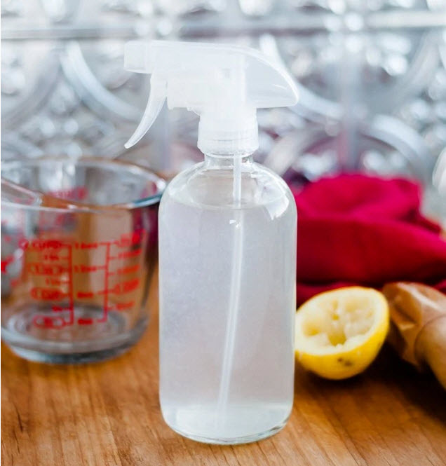 rộn 2 muỗng canh nước cốt chanh, 2 muỗng canh giấm trắng vào cốc nước rồi đổ hỗn hợp này vào bình phun.