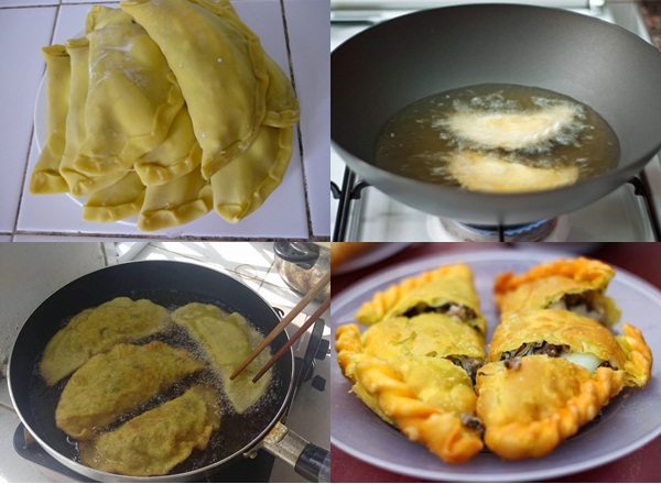 Bước 11: Khi đã gói bánh xong, bạn đặt chảo lên bếp rồi đổ dầu vào trong chảo và đun sôi dầu lên. Sau đó, bạn cho lần lượt những chiếc bánh gối vào trong chảo dầu chiên vàng lên.