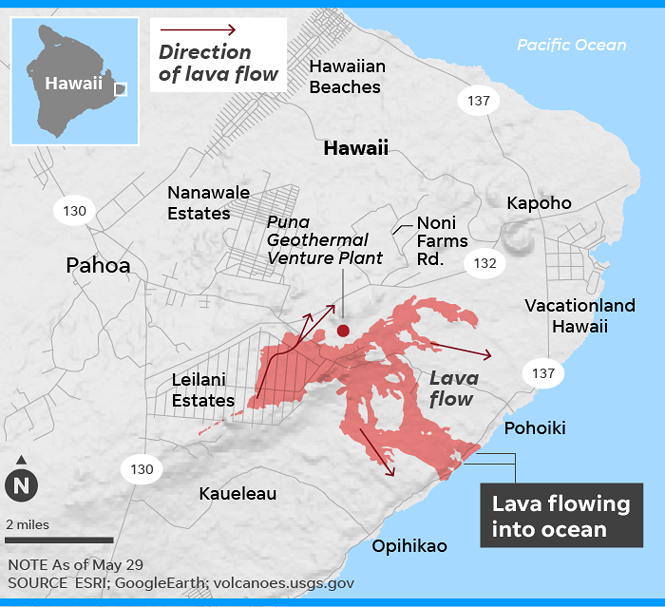 Trong ngày hôm qua, 30/5, dung nham đã chạm đường quốc lộ 132 tại Pahoa, Hawaii. Các nhà chức trách đang lo sợ dung nham có thể tràn qua đảo Lớn (Big Island).