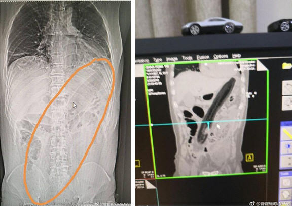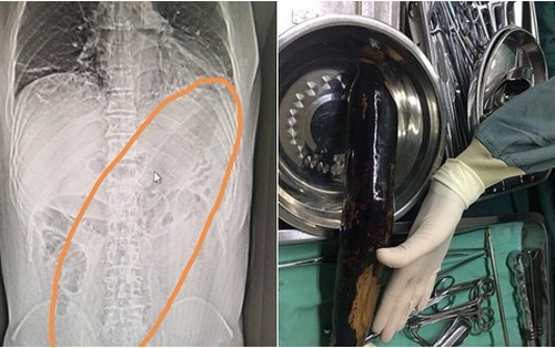 Tại bệnh viện, hình ảnh X-quang cho thấy quả cà tím khổng lồ được đẩy vào mông người đàn ông đã gây ảnh hưởng đến phổi. Các bác sĩ tại bệnh viện phải tìm cách để rút dị vật ra ngoài. Tại đây, người ta đo được quả cà tím dài đến 30cm.
