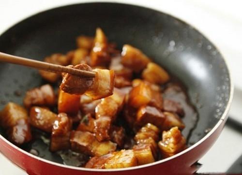 Bắc nồi mới, cho vào 1 thìa dầu ăn rồi phi thơm hành khô. Cho thịt vào đảo nhanh tay để thịt săn lại, sau đó đổ nước hàng vào, thêm vào nồi thịt 1 bát con nước cho xâm xấp mặt thịt. Đun nhỏ lửa khoảng 15 phút