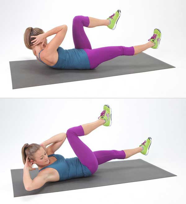 - Thực hiện động tác đạp xe bằng cách đá chân phải tới trước, thu gối trái vào. Lúc này kết hợp vặn người, đưa khuỷu tay phải gần gối trái. Đổi bên. Thực hiện liên tục khoảng 10 - 20 lần mỗi hiệp.