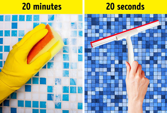 Sau khi tắm xong hãy làm khô tường bằng việc quét chổi lên những khu vực nước bắn lên tường. Nhờ mẹo này, bạn sẽ không cần phải lãng phí thời gian làm sạch tường nhà tắm định kì nữa.