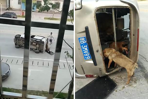 Ngay lập tức người chủ gọi điện báo cảnh sát rồi lái ô tô nhanh chóng đuổi theo. Sau khi bắt kịp chiếc xe của tên cẩu tặc, đến một đoạn đường vắng, ông lập tức nhấn ga áp sát đâm thẳng vào hông chiếc xe tải khiến chiếc xe mất lái lật nhào xuống đường.
