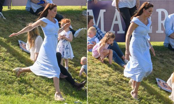 Cả ba mẹ con cùng một vài thành viên hoàng gia khác xuất hiện ở sân đấu polo, nơi Hoàng tử William đang thi đấu trong giải cup Polo từ thiện của hoàng gia tại Câu lạc bộ Polo Beaufort, Gloicestershire.