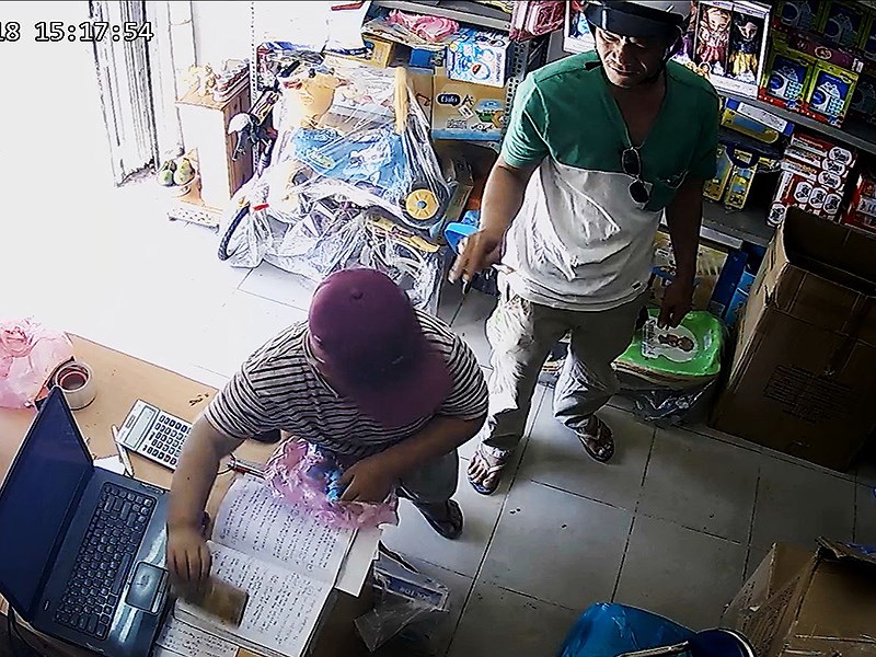 Hai cha con dàn cảnh trộm điện thoại trên đường Phổ Quang, quận Phú Nhuận. (Ảnh do chủ cửa hàng cung cấp)