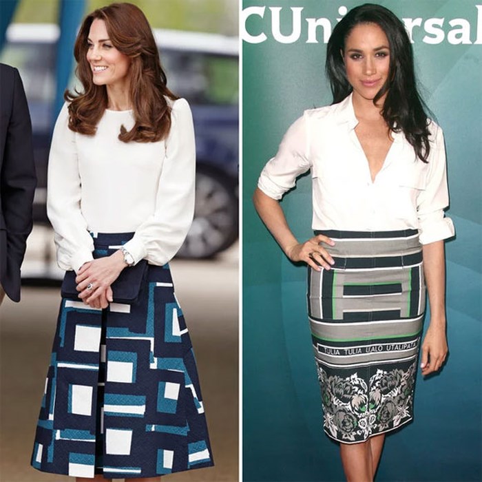 Áo sơ mi trắng kết hợp chân váy họa tiết ấn tượng là lựa chọn của Kate Middleton và Meghan Markle