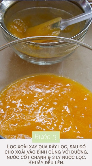 - Lọc xoài qua rây cho mịn rồi đổ vào ly đã chuẩn bị sẵn. Đổ tiếp phần nước đường vừa đun và nước cốt chanh vào. Nếu quá ngọt, bạn có thể cho thêm nước nguội nhé!