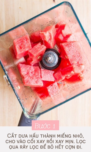 - Bạn xắt dưa hấu thành những miếng nhỏ, cho vào máy xay xay nhuyễn, lọc qua rây cho mịn rồi đổ ra ly.