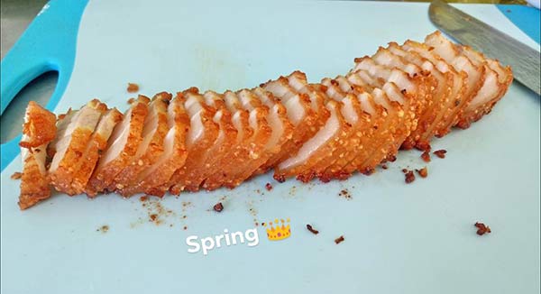 Cho dầu vào chảo nóng, vặn lửa vừa và bắt đầu chiên thịt. Bạn chú ý lật liên tục để miếng thịt chín vàng đều. Đặc biệt, chiên phần mặt da heo cho lâu chút, đến khi thấy bề mặt da đã nổ đều hết là được. Gắp thịt ra giấy thấm dầu, để nguội, cắt vừa miếng.