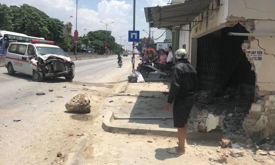 Một xe cấp cứu đang chạy bất ngờ tông đổ tường nhà dân. Vụ tai nạn khiến đầu xe cấp cứu nát bét. Tường của nhà người dân cũng bị hư hỏng. May mắn trên xe không chở bệnh nhân.