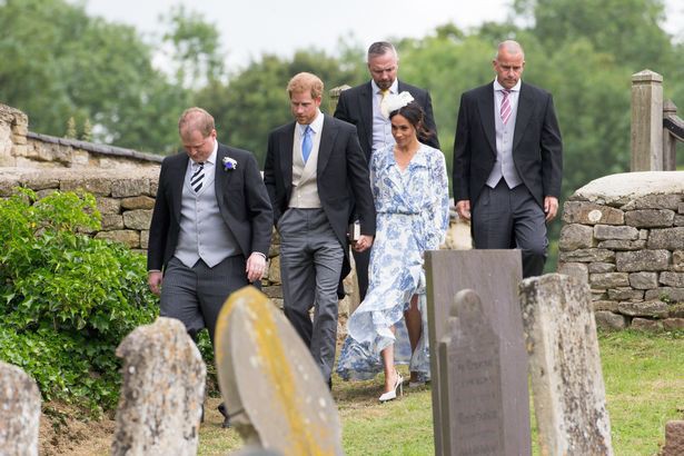 Theo Mirror, ngay khi vừa xuống xe để tiến vào nhà thờ St Andrew và St Mary ở Stoke Rochford, Lincolnshire tham dự đám cưới, Hoàng tử Harry nắm chặt tay vợ không rời và cặp đôi liên tục trò chuyện vui vẻ.