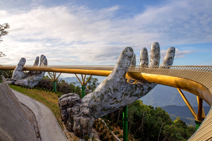 Mới khánh thành thời gian gần đây, cầu Vàng nằm trên khu du lịch nổi tiếng Bà Nà Hills ở Đà Nẵng thu hút sự chú ý của nhiều người nhờ thiết kế đôi bàn tay khổng lồ nâng đỡ đoạn giữa. Cây cầu dài khoảng 150 m, gồm 8 nhịp, uốn cong bên sườn núi. Từ đây, bạn có thể ngắm cảnh mây trời lãng mạn vào buổi sáng hoặc lúc hoàng hôn, dù buổi trưa thời tiết hơi nắng nóng, khó chịu. Điểm bất tiện là cầu ở khá xa thành phố, bạn phải chạy xe hàng chục km mới đến nơi. Đồng thời, mùa hè lại là thời điểm đông du khách nên khó kiếm được chỗ đỗ xe nếu đi ôtô, lại chen chúc nhau đông đúc.