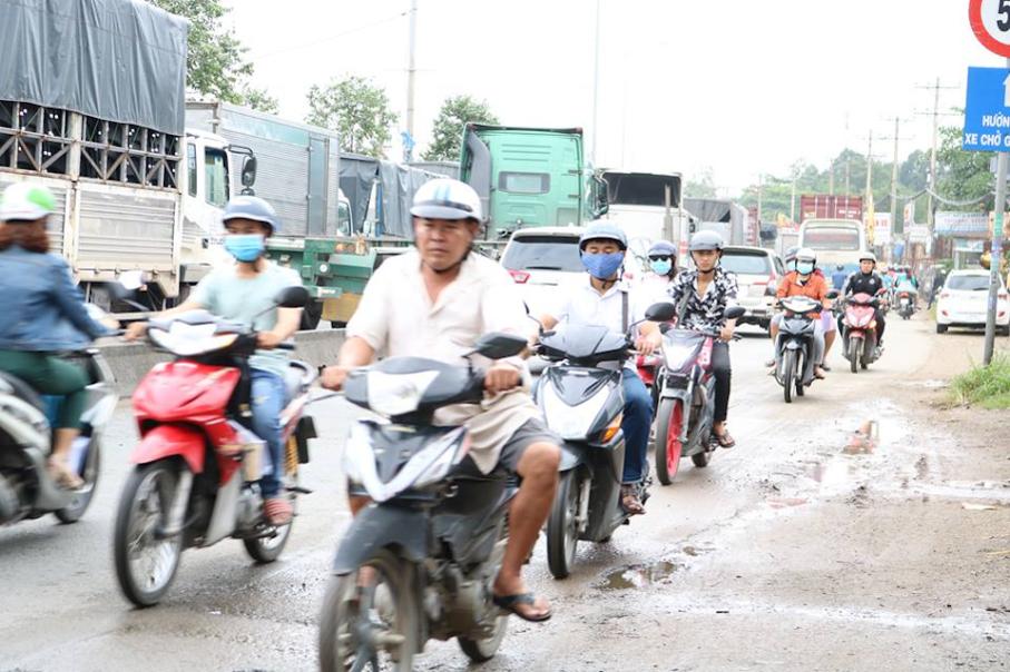 Các xe nối nhau thành hàng dài chạy ngược chiều tại đoạn Đại học Nông Lâm rẽ vào khu ĐHQG. Mỗi ngày, đoạn đường này có hàng trăm xe máy chạy ngược chiều để rẽ vào khu ĐHQG. Điều đáng nói, đây là tuyến đường có lượng xe buýt, xe tải qua lại rất đông.