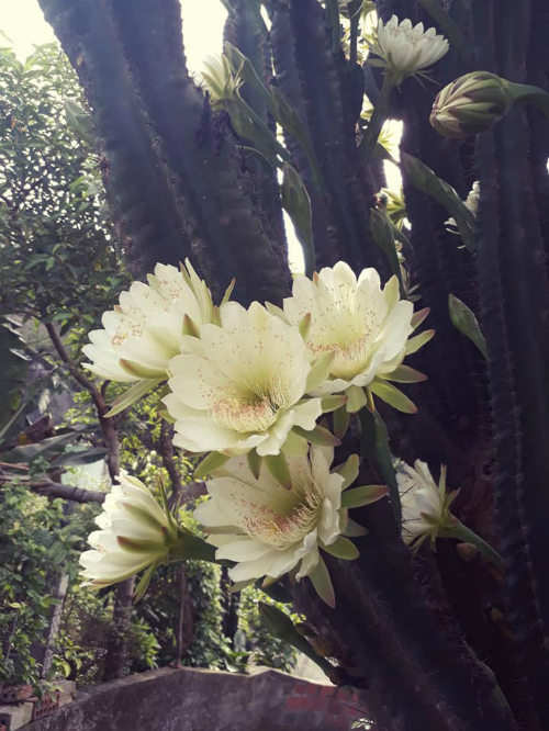 Tài khoản Hang Pham (Cẩm Phả, Quảng Ninh) vừa chia sẻ lên mạng xã hội những hình ảnh về cây hoa xương rồng khổng lồ đang nở hoa rực rỡ. Cô viết: "Cây xương rồng nhà mình trồng gần 30 năm nay rồi. Mỗi mùa ra hoa là ong bay đến đậu quanh luôn. Hoa của nó chỉ nở vào sáng sớm tới 9h sáng là tàn rồi. Hôm nay là một đợt hoa đấy các bạn nhé. Nghe tin cây ra hoa mình phải phi vội về nhà để chụp lại. Nhìn hoa mà lòng ngất ngây".