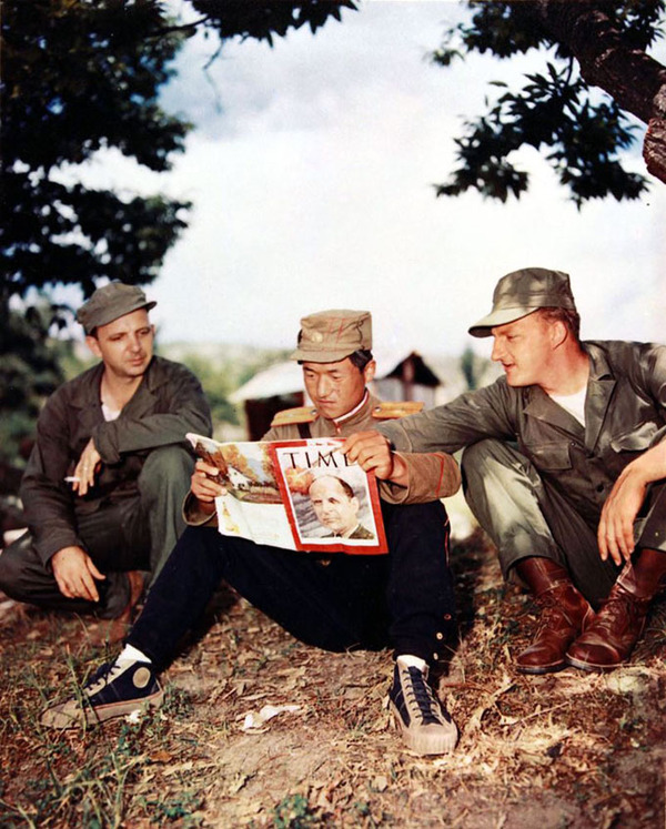 Bức ảnh này được chụp ngày 8/7/1951, ở giữa là một binh sĩ Triều Tiên đang nhìn vào tạp chí Time (Mỹ), bên cạnh là hai binh sĩ Mỹ trong cuộc đàm phán ngừng bắn ở Gaesong.