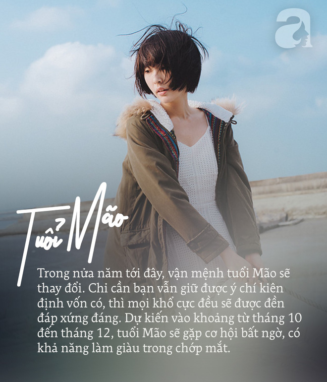 Tuy nhiên, câu chuyện xui rủi giờ chỉ là quá khứ, trong nửa năm tới đây, vận mệnh tuổi Mão sẽ thay đổi. Chỉ cần bạn vẫn giữ được ý chí kiên định vốn có, thì mọi khổ cực đều sẽ được đền đáp xứng đáng. Dự kiến vào khoảng từ tháng 10 đến tháng 12, tuổi Mão sẽ gặp cơ hội bất ngờ, có khả năng làm giàu trong chớp mắt, bao nhiêu nợ nần tồn đọng đều được trả hết, không những thế còn có dư để làm vốn kinh doanh hoặc thực hiện những dự định khác.