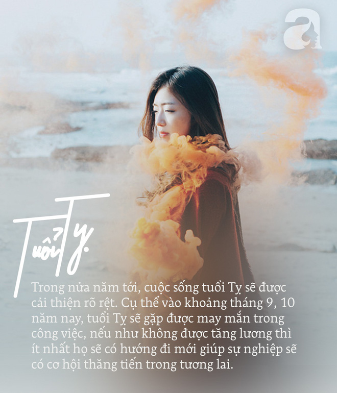 Tuy nhiên, trong nửa năm tới, cuộc sống tuổi Tỵ sẽ được cải thiện rõ rệt. Cụ thể vào khoảng tháng 9, 10 năm nay, tuổi Tỵ sẽ gặp được may mắn trong công việc, nếu như không được tăng lương thì ít nhất họ sẽ có hướng đi mới giúp sự nghiệp sẽ có cơ hội thăng tiến trong tương lai. Sau khoảng thời gian đó, vận may sẽ quay trở lại với tuổi Tỵ, giúp họ làm mọi thứ đều suôn sẻ, thuận lợi, dự kiến cuối năm sẽ đạt được thành công ngoài mong đợi.