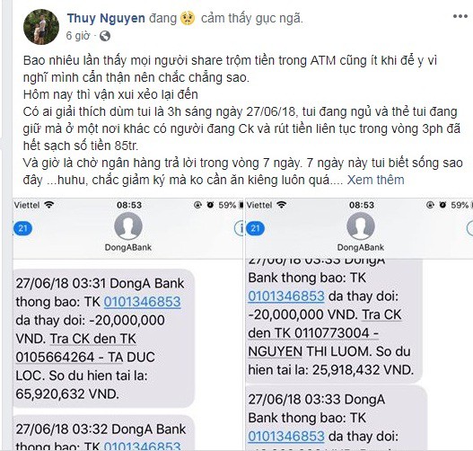 Chị Thùy chia sẻ, khi tiền trong tài khoản “bốc hơi” thì thẻ ATM của chị vẫn nằm trong túi xách cá nhân. Chị đã liên hệ với bộ phận chăm sóc khách hàng của Ngân hàng Đông Á để giải quyết. Nhân viên ngân hàng thông báo, tiền trong tài khoản của chị Thùy được rút ở một cây ATM trên địa bàn quận Tân Phú, TPHCM và thông tin sự việc đã được chuyển lên hội sở DongA Bank.