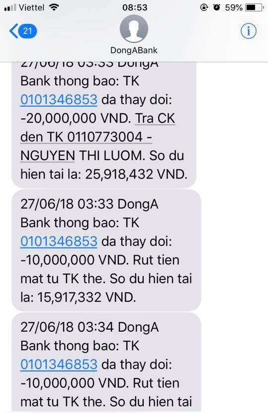Cụ thể, từ 3h31 phút đến 3h33 phút cùng ngày, hệ thống từ DongA Bank đã gửi tin nhắn đến điện thoại của chị Thùy và thông báo tài khoản của chị đã chuyển 60 triệu đồng vào 3 tài khoản khác nhau. Mỗi lần chuyển khoản là 20 triệu đồng.