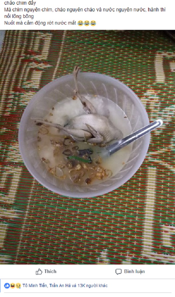 Trong bức ảnh người vợ trẻ chụp là hình ảnh con chim câu đã làm sạch lông, tuy nhiên vẫn còn nguyên con, chưa nhừ, thậm chí cháo vẫn còn nguyên nước lõng bõng, dù có hành phi rắc ở trên như nhà hàng nhưng trông bát cháo vẫn vô cùng kém hấp dẫn.
