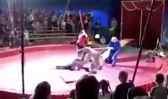 Ngay sau đó, một thành viên nam của đoàn xiếc đã dùng gậy đánh con gấu nhưng điều này chỉ càng làm nó phát điên. Trẻ em đã hét lên thất thanh khi con gấu lao vào tấn công người đàn ông, vật ngã nạn nhân xuống sàn.