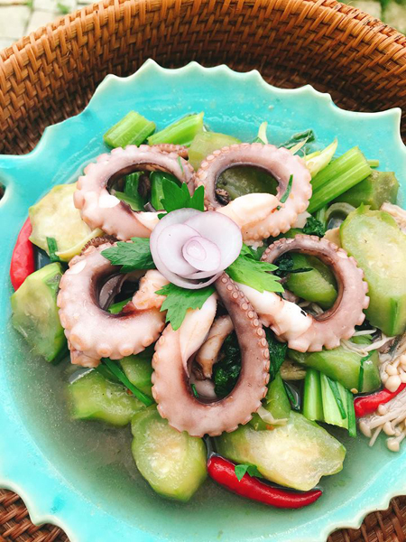 Bạch tuộc giòn kết hợp với mướp mềm tưởng đối chọi mà lại hợp đến không ngờ.