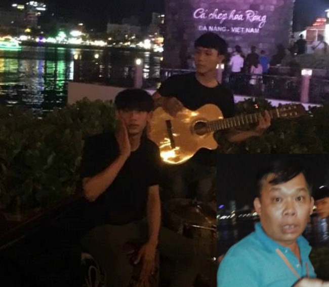 Ông Trần Văn Trúc (ảnh nhỏ, áo xanh) lớn tiếng nạt nộ, chỉ mặt sinh viên biểu diễn nhạc (ảnh lớn) và du khách