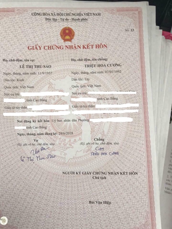 Ngay lập tức thông tin này đã "gây bão" trên mạng xã hội, nhiều người không tin, cho rằng đây là ảnh ghép cho đến khi nhìn thấy tờ giấy đăng ký kết hôn của cặp đôi, trên đó ghi rõ thông tin cá nhân và địa chỉ của cô dâu, chú rể. Theo đó, cô dâu có tên Lê Thị Thu Sao sinh ngày 11.9.1957 tại TP Cao Bằng, còn chú rể tên là Triệu Hoa Cương sinh ngày 7.1.1992 tại huyện Thạch An, Cao Bằng.