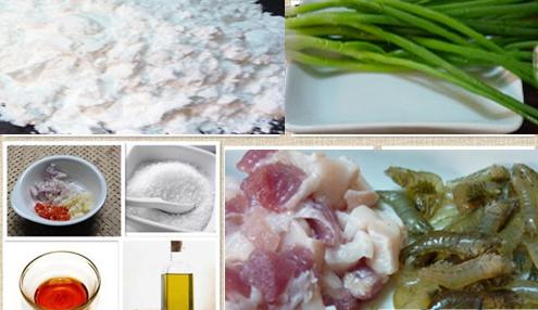 - Phần nhân: 200gr tôm loại nhỏ; 200gr thịt ba chỉ; 1 muỗng canh phần trắng hành lá băm; 1 muỗng canh tỏi hành băm; 1 muỗng cà phê nước mắm; 1 muỗng canh đường; 1 muỗng cà phê bột nêm; 1/4 muỗng cà phê tiêu.