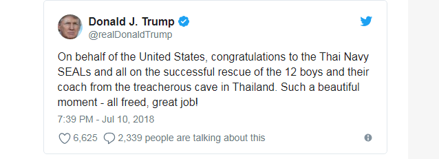 “Thay mặt cho nước Mỹ, xin chúc mừng Hải quân Thái Lan giải cứu thành công 12 cậu bé và huấn luyện viên từ hang động nguy hiểm ở Thái Lan. Thật là một khoảnh khắc đẹp – tất cả đã tự do, rất tốt!” – ông Trump viết.