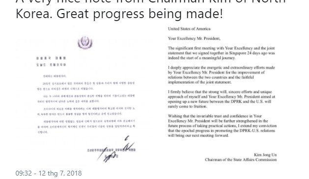 Ông Pompeo tuần trước đã dẫn đầu một phái đoàn Mỹ tới Bình Nhưỡng để tiếp tục đàm phán về vấn đề phi hạt nhân hóa bán đảo Triều Tiên. Trên trang twitter, Tổng thống Trump đã ca ngợi tiến triển đạt được trong đàm phán với Triều Tiên đồng thời cũng công bố nội dung bức thư.